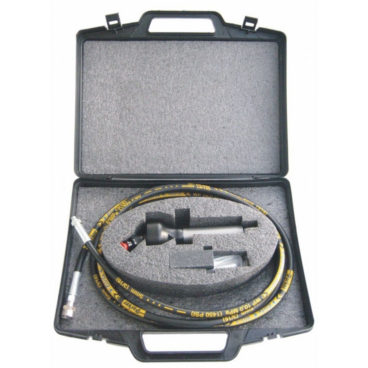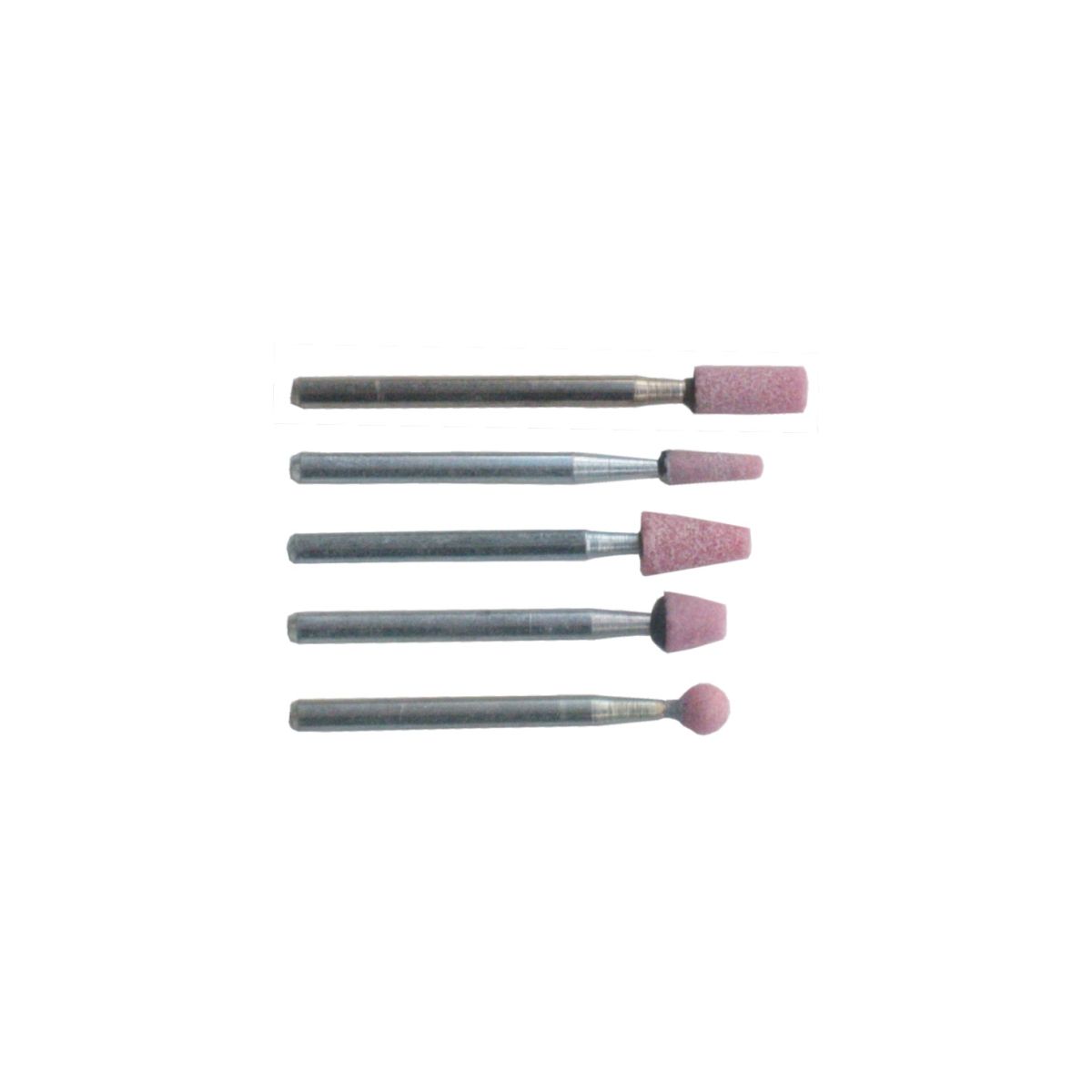 Tool with collet chuck Ø 6 mm, quick-coupling nipple, assembly wrench, 5 grinding pins, whetting stone, air hose and case.