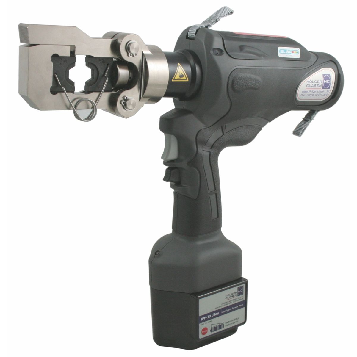 Das Akku-hydraulische Crimpwerkzeug PressMax 6 ist mit 60 kN ein leichtes, kleines und kraftvolles Presswerkzeug. Es lässt sich dank austariertem, ergonomischem Gehäuse problemlos mit einer Hand handhaben. Dank der kompakten Bauform und dem schmalen, um 180° drehbaren Presskopf sind auch Verpressungen in beengten Verhältnissen, wie beispielsweise im Schaltschrankbau, möglich. Unterstützend ist dabei die LED zur Arbeitsfeldausleuchtung. Der Presskopf lässt sich mit handelsüblichen Federbügel-Presseinsätzen aber auch Zapfen-Presseinsätzen bestücken, die in dem Presskopf mit Klinke und Bügel sicher positioniert werden können. Volle Werkzeugkontrolle erhalten Sie über den Vorlauf- und Rücklaufknopf, mit denen Sie jederzeit die Kontrolle über den Verpressvorgang behalten. Die integrierte Funktionssteuerung ELWA basic unterstützt mit einem farblichen LED-Signal, bei erfolgreicher Verpressung. Mit 15 mm Hub und der entsprechenden Kraft in optimal abgestimmter 2-Stufen-Hydraulik können Sie mit dem Akku-Crimpwerkzeug auch Querschnitte DIN Sechskant Cu/Al bis 240 mm2 pressen. Der im Set enthaltene Lithium-Ionen-Akku IPP-40 ist mit allen handgeführten Akku-hydraulischen Werkzeugen in 14,4-V-Technologie von HOLGER CLASEN kompatibel.