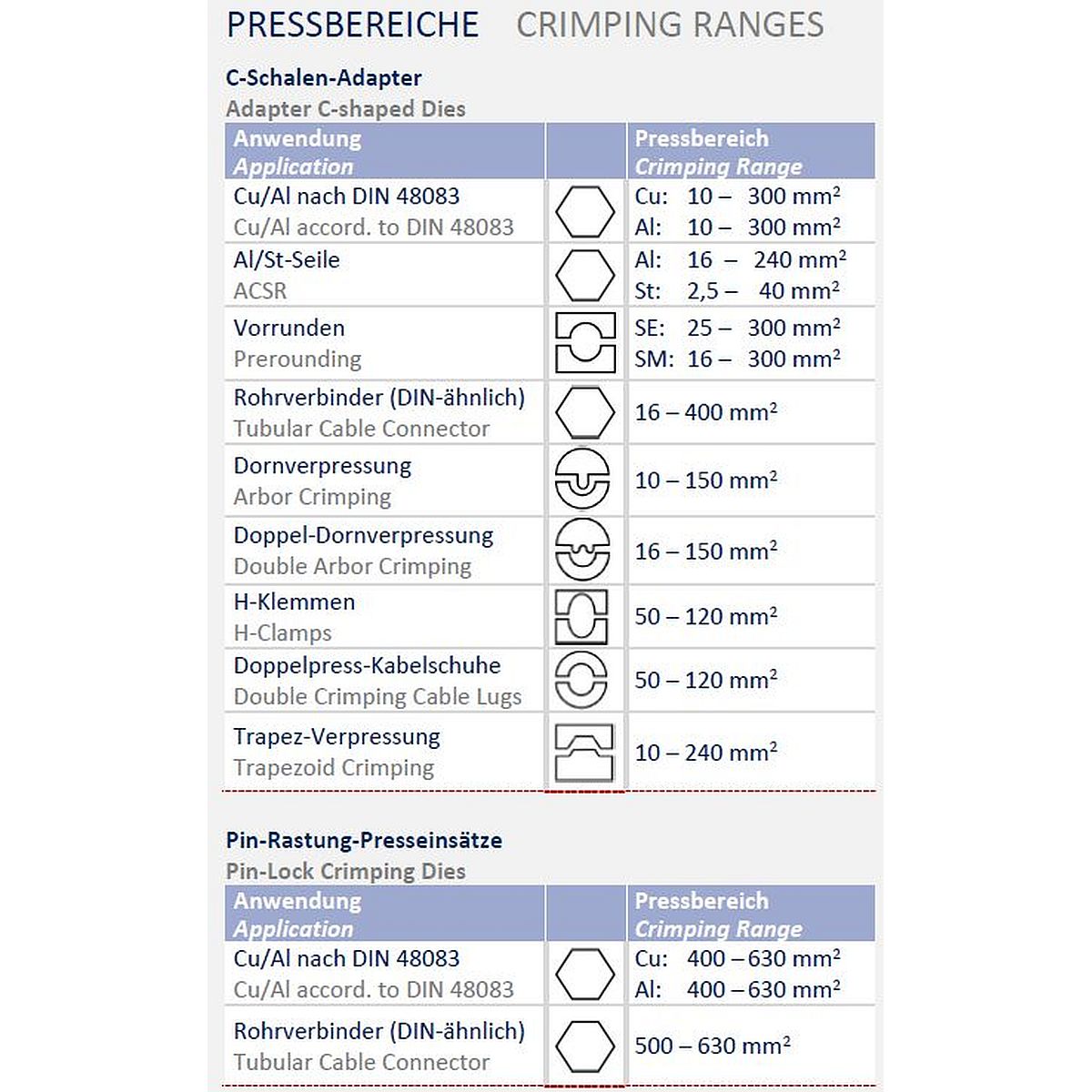 | Pressbereich DIN Cu: | 10 - 630 mm² |