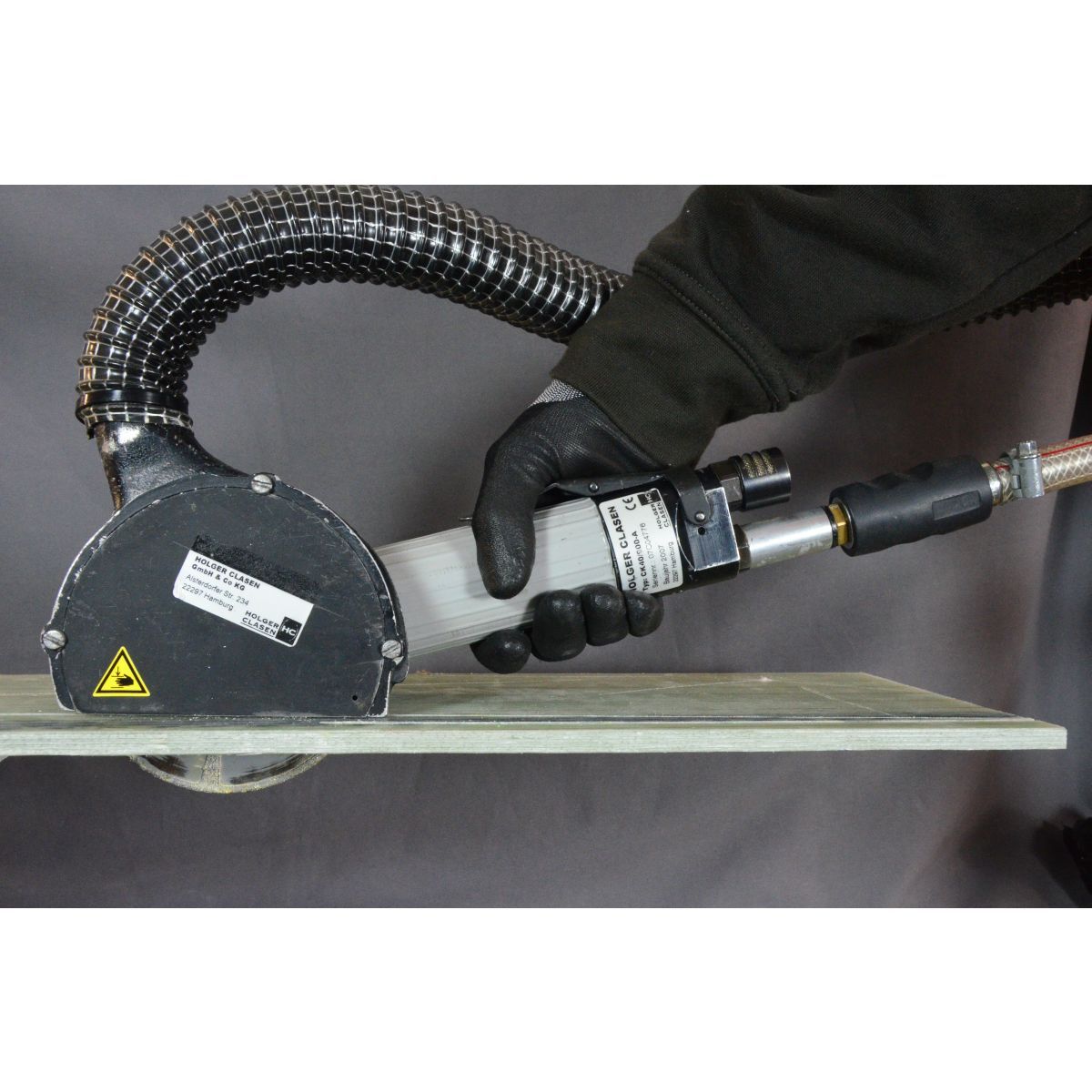 Der Druckluft-GFK-Schneider CK40/900-A ist dank des Scheibendurchmessers von 100 mm gerade im Formenschnitt ein vielseitig einsetzbares Werkzeug. Mit seinen 15 mm Schnitttiefe trennt er Kunststoff- sowie GFK-Platten auch aufgrund der gut abgestimmten Schnittgeschwindigkeit und liefert zuverlässig saubere Schnitte, die kaum eine Nachbearbeitung erfordern. Dabei saugt das Werkzeug direkt am Entstehungsort die unerwünschten, häufig Gesundheit schädigenden Stäube effektiv in eine externe Staubabsauganlage. Die gute Auflagekante macht das leichte und handliche Werkzeug zu einem präzise und gut zu führenden Werkzeug für den industriellen Einsatz.