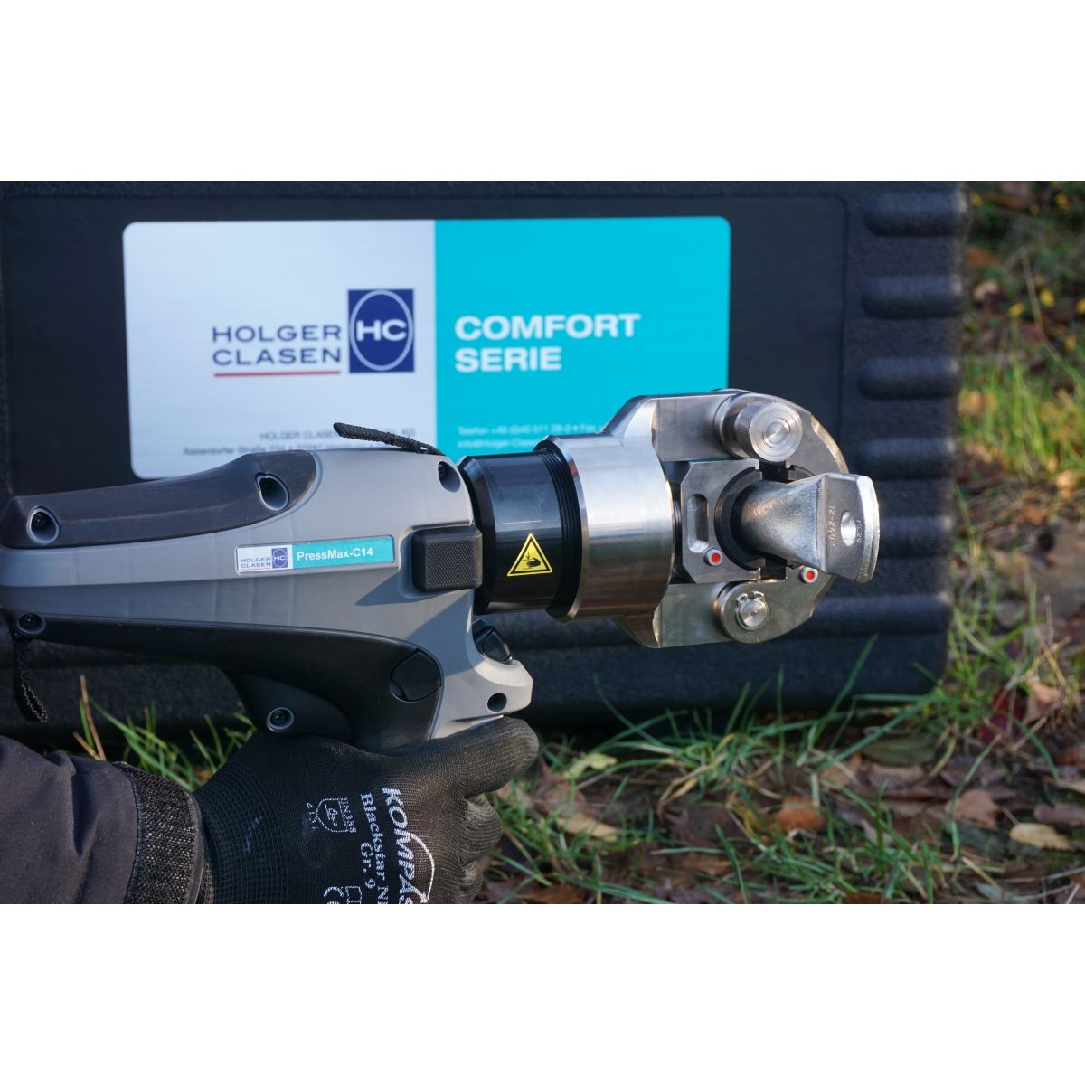 The PressMax-C14 battery-powered hydraulic crimping tool offers maximum performance and precise handling for professional users in the energy sector, electrical industry, energy supply companies, municipal utilities, and industrial cable assembly. With a powerful 140 kN crimping force, sophisticated design, and innovative safety features, the PressMax-C14 enables time-saving and reliable wide crimping in the DIN range with optimum ease of use - even in unusual installation situations.