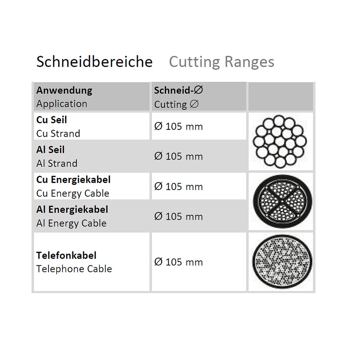 - Copper and aluminum cables class 1 and 2 (solid, stranded, sector-shaped) as well as power cables up to Ø 105mm