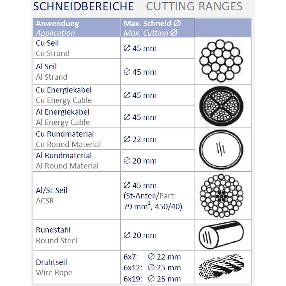 Secure cutting due to closed, pivoting cutting head.Thanks to optimized transmission of power (guillotine principle) the tool cuts even hard material (e.g. ACSR).
