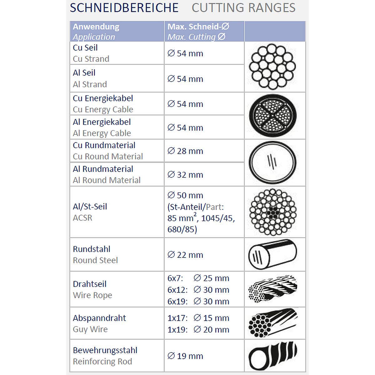 The tool cuts sector-shaped wires, ACSR, wire ropes and steel-armored cables.The hand-hydraulic cutting tool is particularly suited for guy wire and overhead lines with great diameters.