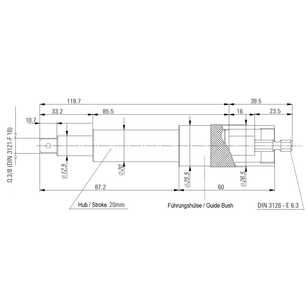 | Chuck: | External hexagon 1/4" DIN 3126 - E6.3 / Outside square 3/8" DIN 3121 - F10 |