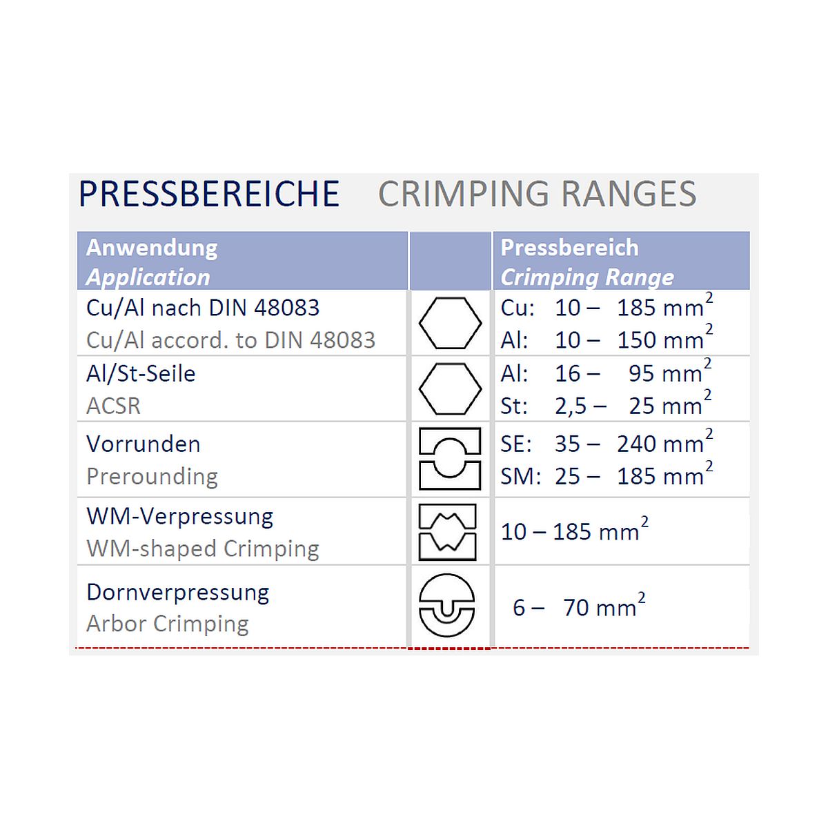 | Pressbereich DIN Al: | 10 - 150 mm² |