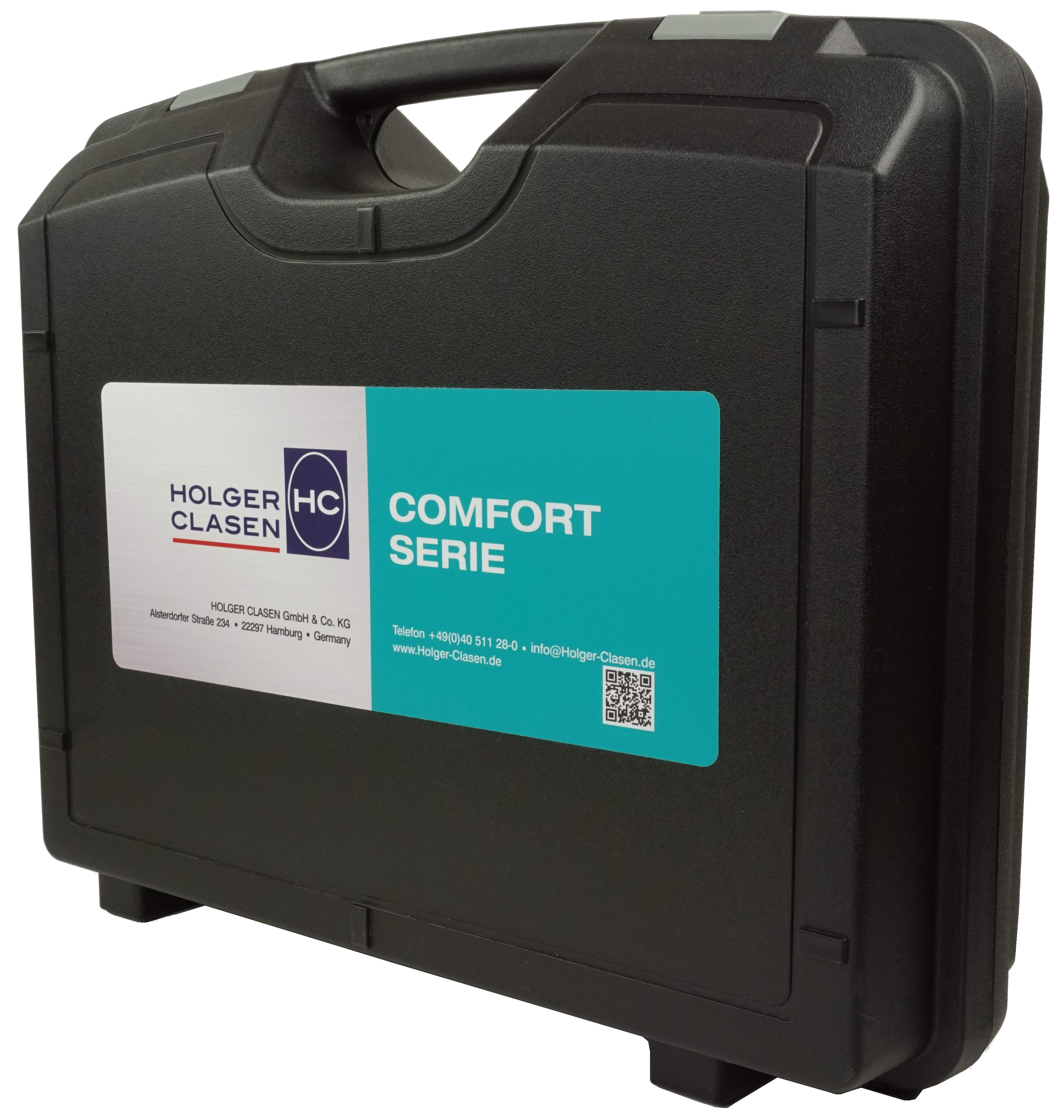 Leichter Kunststoffkoffer mit Fächern für einen Comfort Serie Akkuschneider, zwei Akkus und ein Ladegerät.