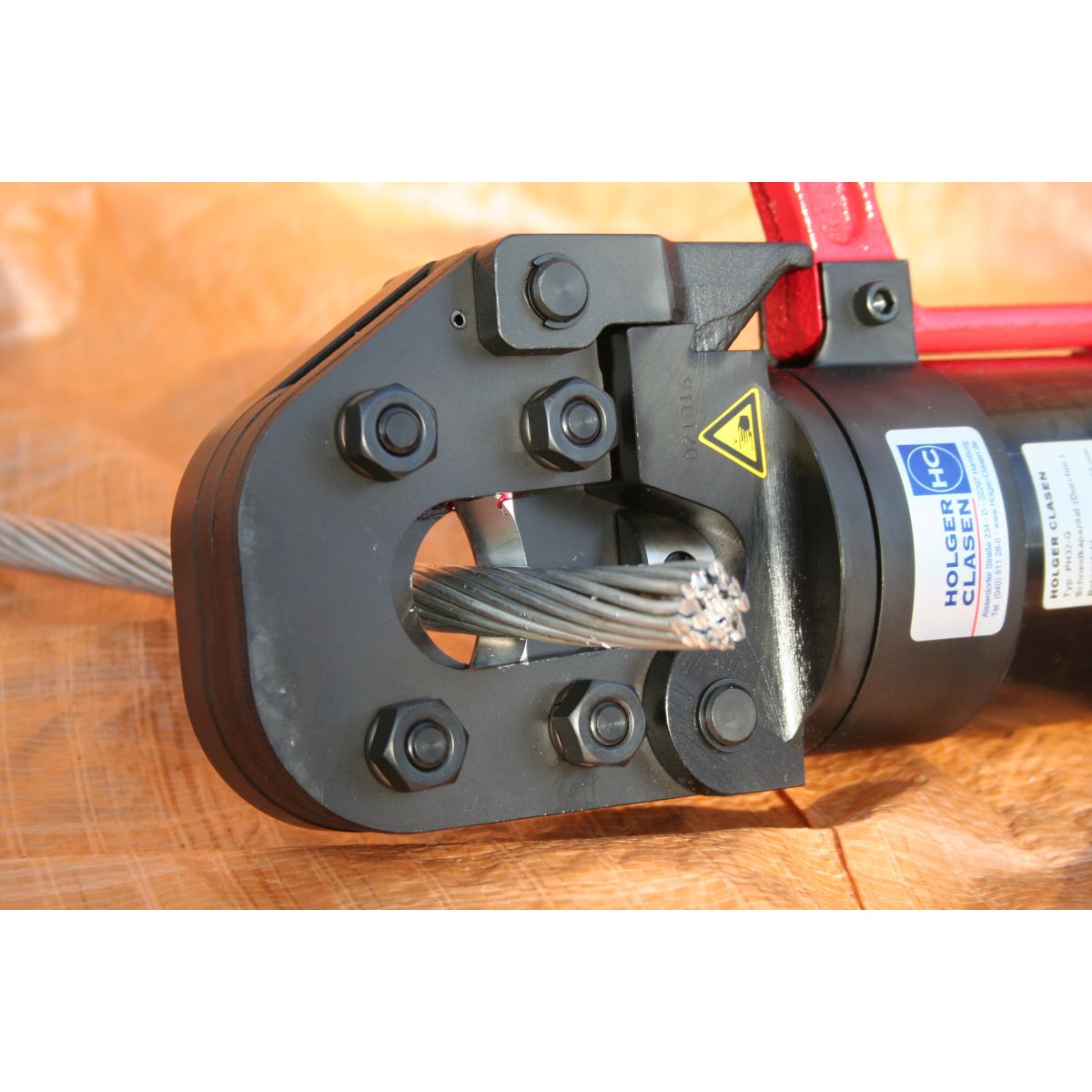Hydraulischer Schneidkopf zum Anschluss an eine separate Pumpe, zum Schneiden von Vollmaterial, insbesondere Stahl, bis zu einem Durchmesser von 32 mm; in den Bereichen EVU, Stadtwerke und deren Dienstleister, Kraftwerke, Verkehrsbetriebe sowie im Bereich von Personen- und Lastenaufzügen.