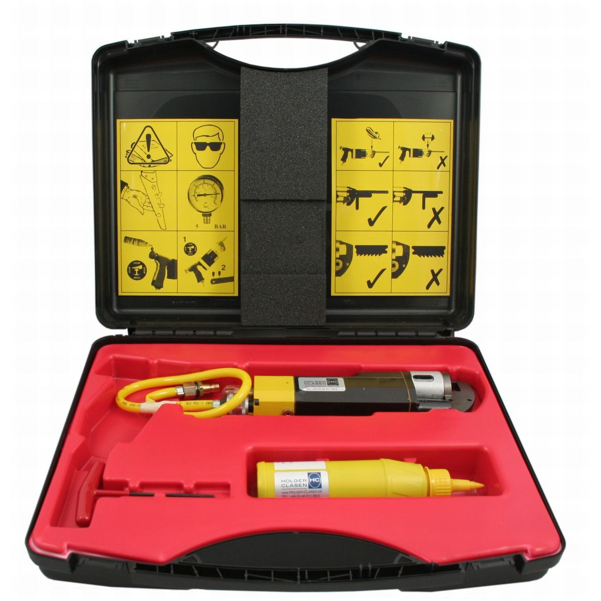 Werkzeug, Zuluftschlauch, Schnellkupplungsnippel, Montagewerkzeug, Sägeblätter, Druckluftöl, Transportkoffer.